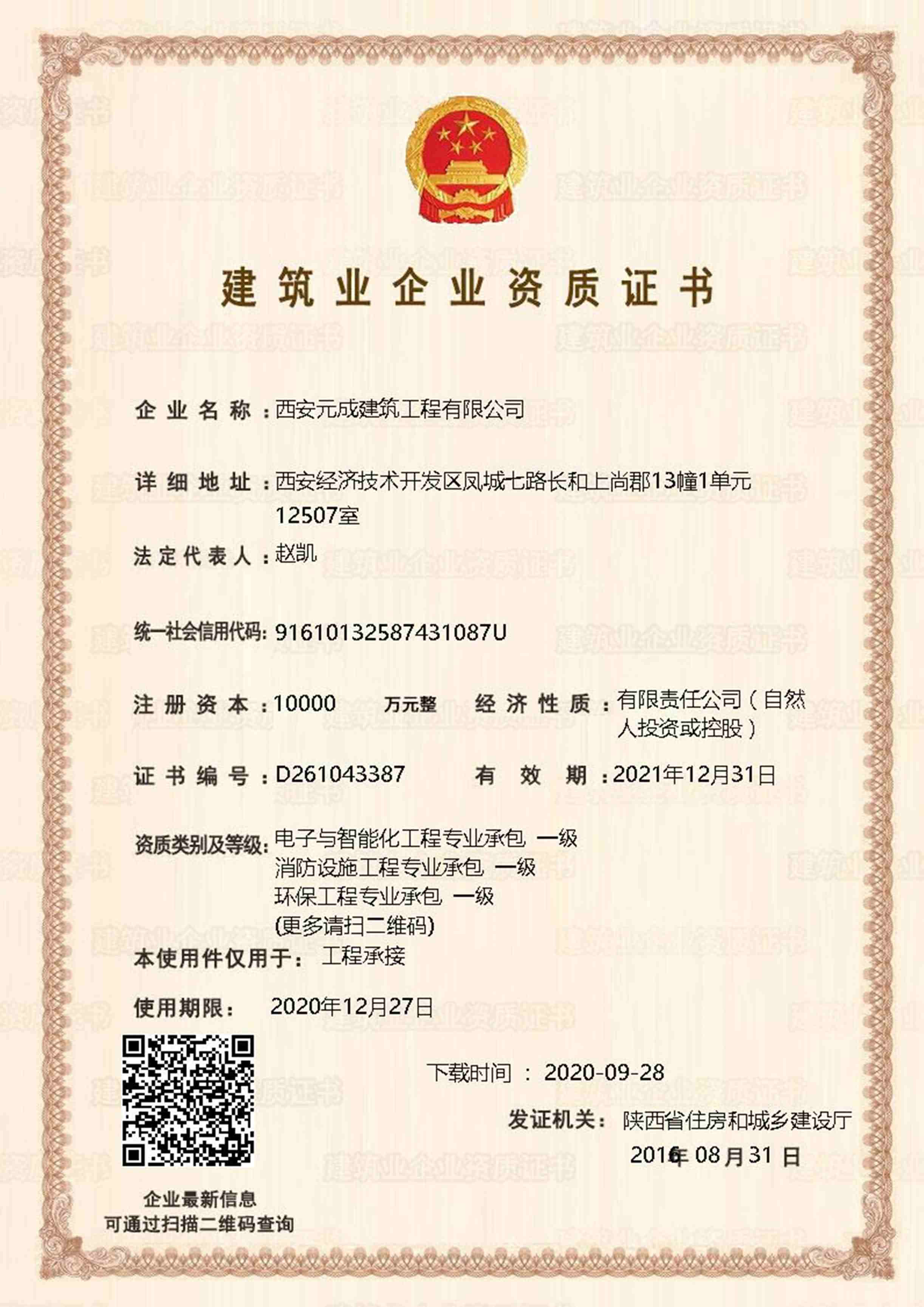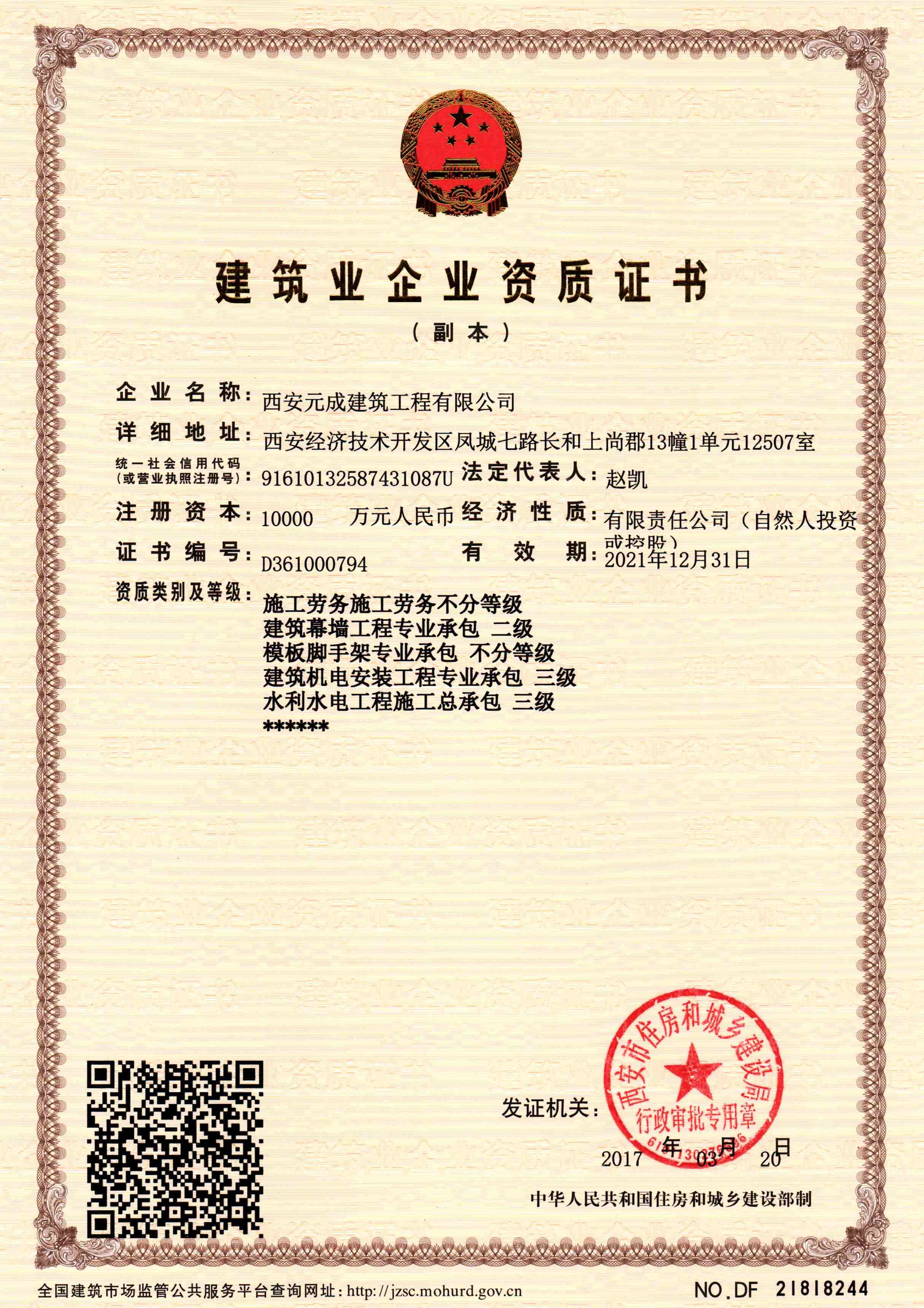 西安元成建筑工程有限公司成立于2012年,是一家擁有建筑工程、市政公用工程、石油化工工程、機(jī)電工程施工總承包貳級;鋼結(jié)構(gòu)工程、防水防腐保溫工程專業(yè)承包貳級;電力工程、水利水電工程施工總承包叁級;建筑機(jī)電安裝工程、輸變電工程、環(huán)保工程專業(yè)承包三級;模板腳手架專業(yè)承包、勞務(wù)分包等綜合性施工企業(yè)。